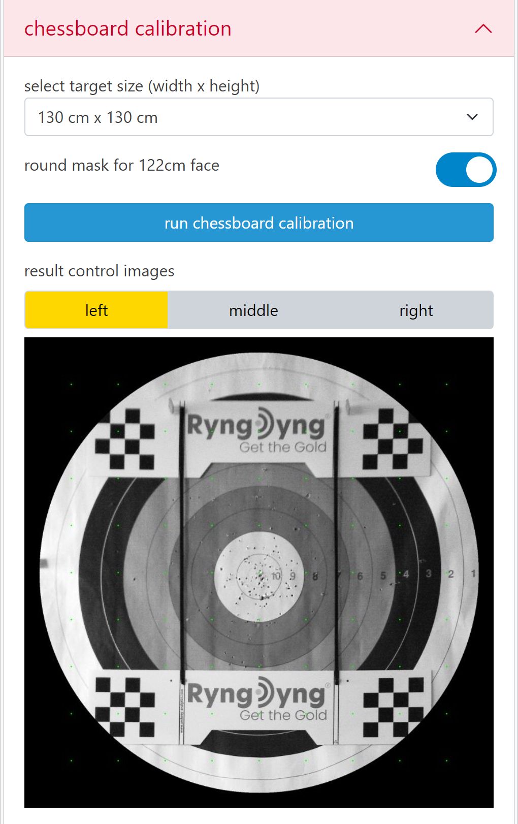 After you have aligned RyngDyng correctly, you can continue with the chessboard calibration. This calibration process determines the geometric position of RyngDyng in relation to the target and is the basis for the optical measurement of the arrow positions. After the chessboard calibration, the position of the RyngDyng in relation to the target must not be changed!