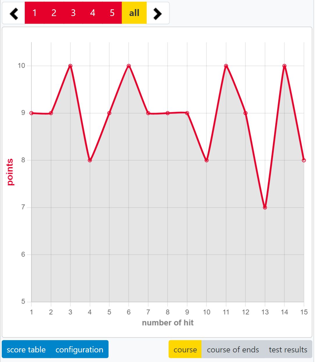 Evaluations of the course of the score numbers are visible with the button course (left image). The course of ends button generates the diagram with important key figures for the individual ends (picture on the right). Here you can see, for example, how your performance has changed over the course of a training day or a tournament.