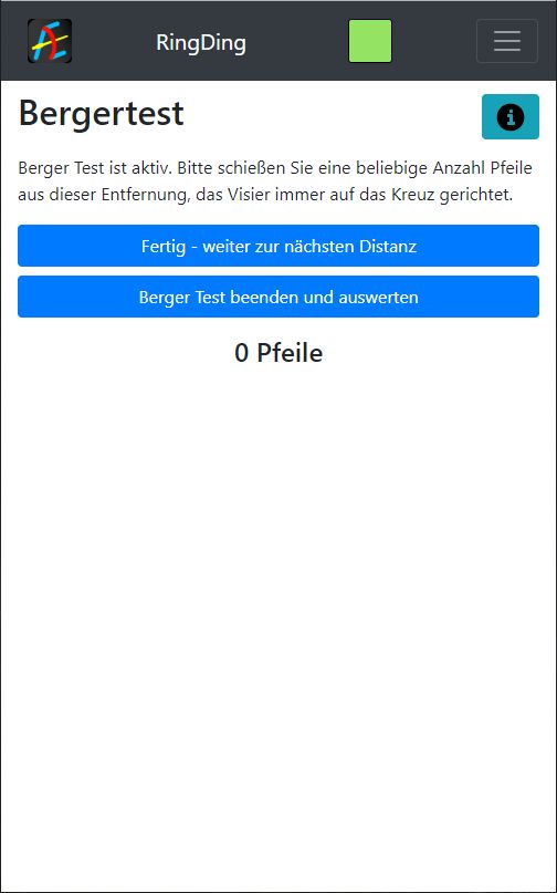 Nach dem Starten des Bergertests schießt der Schütze beliebig viele Pfeile auf die unterschiedlichen Entfernungen, z.B. 3 Pfeile auf 5m, 3 Pfeile auf 10m und 4 Pfeile auf 15m, usw. (rechtes Bild). Die Anzahl der Pfeile pro Entfernung kann von jedem Schützen selbst festgelegt werden.