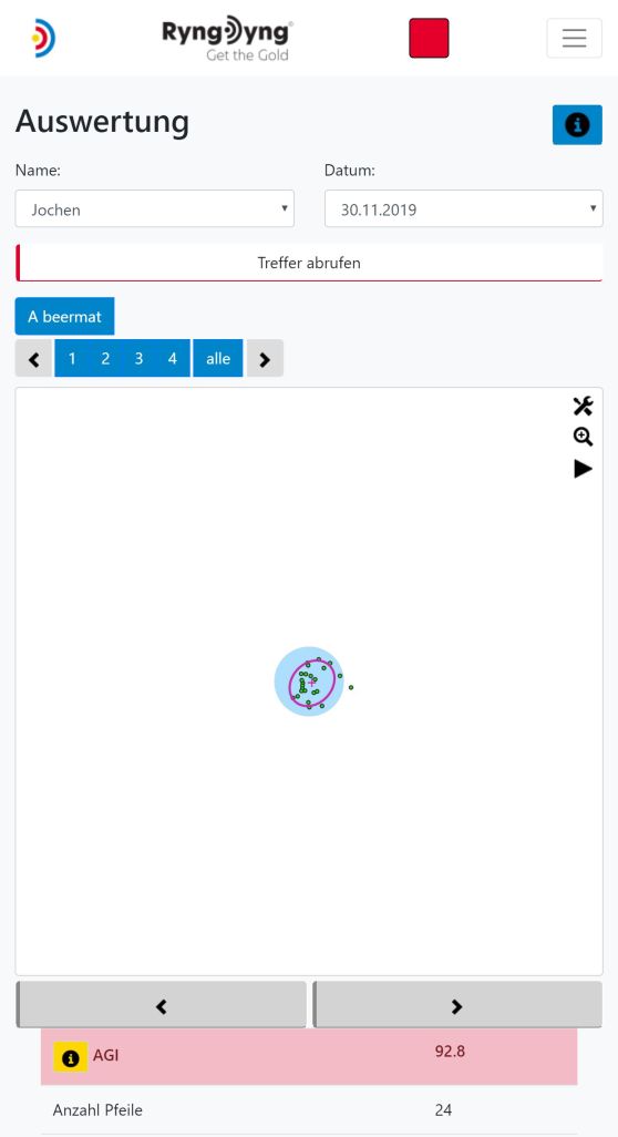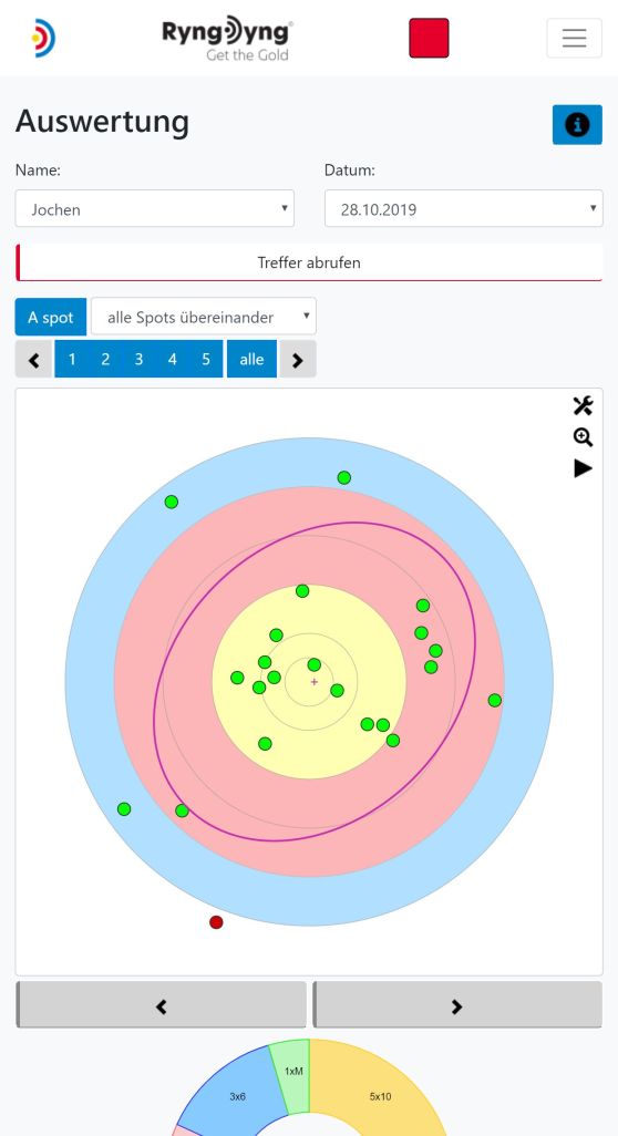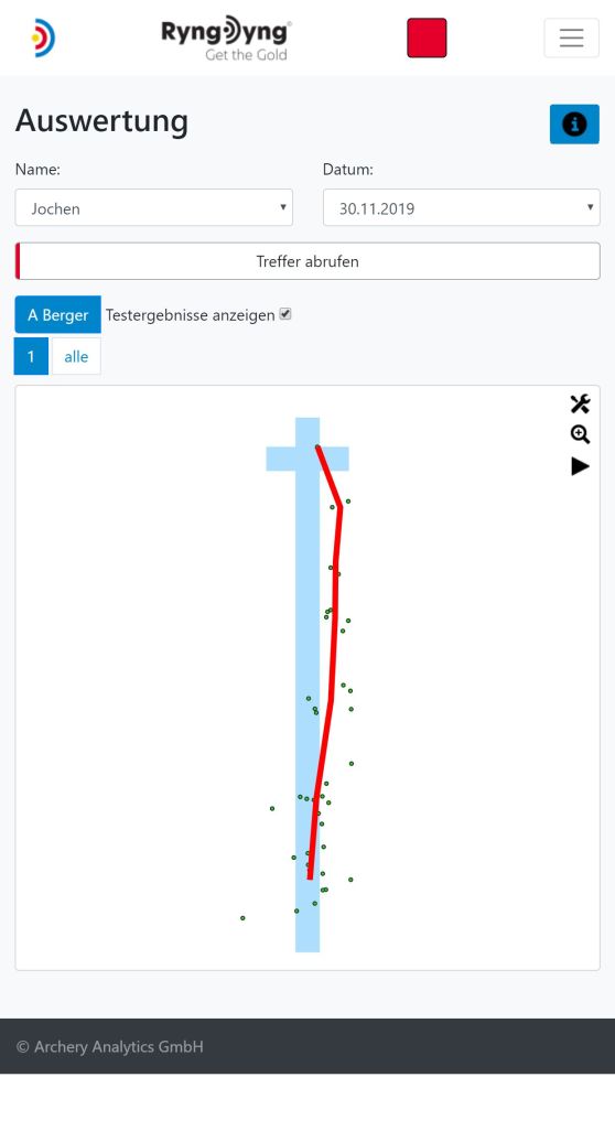 In der Ansicht Auswertung kannst du alle gespeicherten Treffer bereits auf dem Platz analysieren. Besteht eine Verbindung zu einem RyngDyng© , so werden die auf diesem RyngDyng© gespeicherten Treffer abgerufen und angezeigt. Gleichzeitig werden sie in der Datenbank der RyngDyng© App gepspeichert, so dass du sie immer wieder abgerufen kannst. Besteht keine Verbindung zu einem RyngDyng© , so werden die Treffer aus der Datenbank der RyngDyng© App angezeigt. Die RyngDyng App synchronisiert zudem alle gespeicherten Treffer mit deinem persönlichen Account in der Archery Analytics Cloud hier auf diesem Server. Somit können auf dem Server ebenso die Treffer angezeigt und analysiert werden.