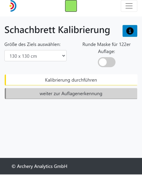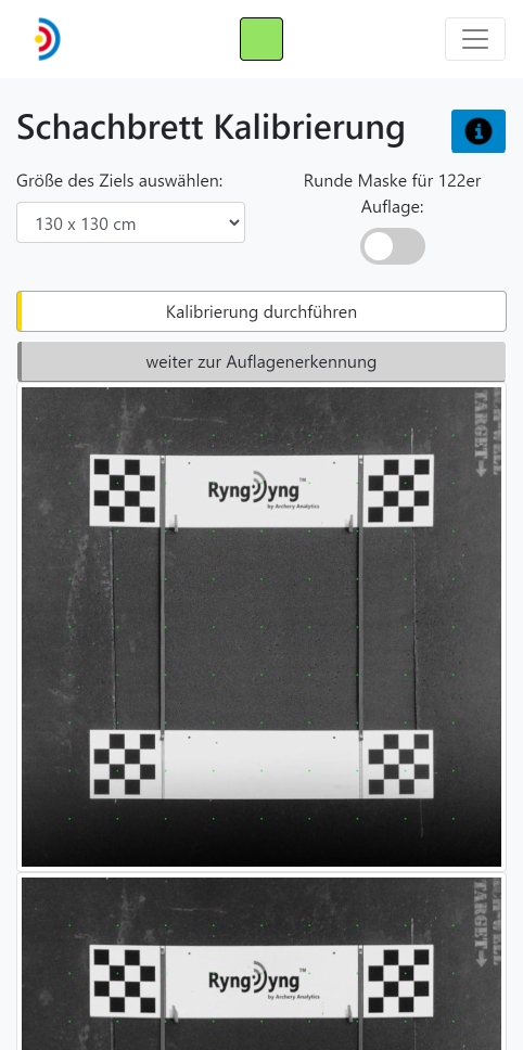 Nachdem du das RyngDyng korrekt ausgerichtet hast, drückst du den Knopf 'weiter zur Schachbrett Kalibrierung' und gelangst so zur Ansicht weiter unten links im Bild. Dieser Kalibrierungsvorgang legt die geometrische Position des RyngDyngs gegenüber der Scheibe fest und ist die Grundlage für die optische Vermessung der Pfeilpositionen. Nach der Schachbrett Kalibrierung darf die Position des RyngDyng gegenüber der Scheibe nicht mehr verändert werden!
