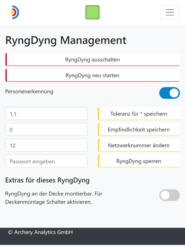 Das System Menu in der RyngDyng© App dient zum Steuern und Warten des Systems. Wählst du System->RyngDyng© aus, so gelangst du zur Ansicht RyngDyng© Management. Hier kannst du das RyngDyng© ausschalten, neu starten, oder die Netzwerknummer ändern. Ebenso werden hier einige Systemparameter verwaltet, wie z.B. die Toleranz für die *-Anzeige bei sehr knappen Entscheidungen bez. der Ringzahl. Die Empfindlichkeit der Pfeilerfassung kann ebenfalls verändert werden im Bereich -30 bis +5. Wenn beispielsweise Wind die Papierauflage bewegt und dies zu falschen Pfeilen führt, kann man einen Wert von -5 eingeben und damit die Pfeilerfassung unempfindlicher machen. Verwendet man Pfeilschäfte mit sehr heller Farbe, etwa silbrig, so wird die Erhöhung der Empfindlichkeit auf +2 eine zuverlässigere Pfeilerfassung ermöglichen.