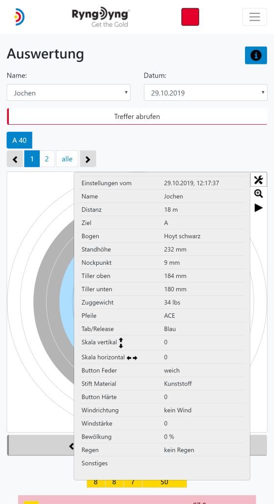 Grundsätzlich speichert die RyngDyng© App alle Treffer, die zu den angelegten Personen gehören. Du wählst also zuerst die betreffende Person aus und danach den Tag, zu dem die Treffer analysiert werden sollen. Nachdem die Treffer abgerufen wurden, siehst du, auf welche Auflagen an dem ausgewählten Tag geschossen wurde und welche Passen aufgezeichnet wurden.