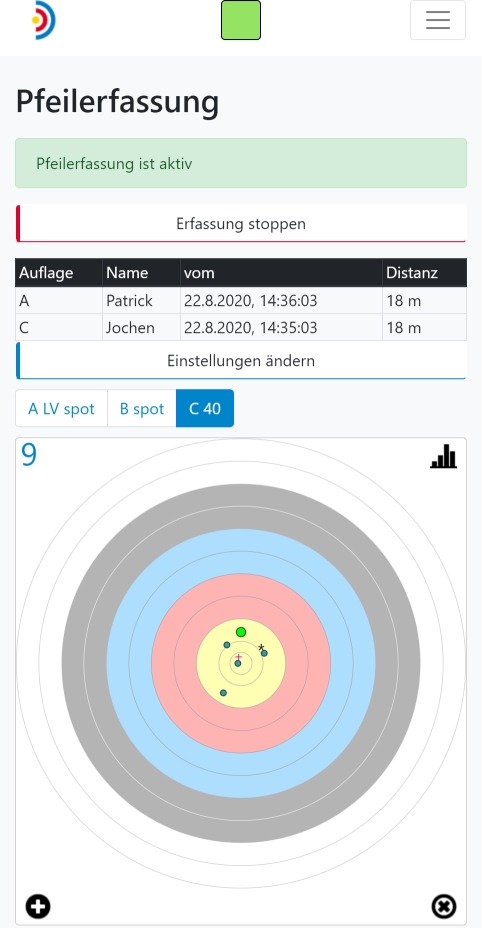 Ist die Pfeilerfassung aktiv, so zeigt die App diesen Status in dem grünen Feld an. Jeder erkannte Treffer wird live angezeigt, siehe rechtes Bild. Der neu hinzugekommene Treffer wird größer und in grün dargestellt. Die gemessene Punktzahl erscheint links oben. Bereits vorhandene Treffer bilden graue Punkte mit einer Größe, die dem tatsächlichen Pfeildurchmesser entspricht.