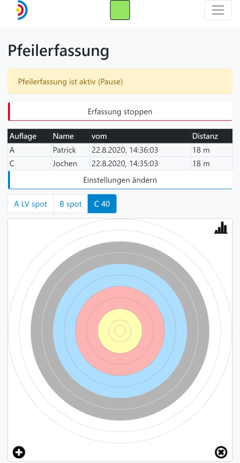 Die für den eigentlichen Betrieb wichtigste Ansicht ist die 'Pfeilerfassung'. Hier kannst du die Pfeilerfassung starten und stoppen sowie das Eintreffen aller Pfeile live verfolgen.