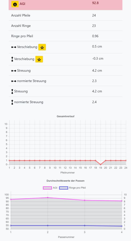 Das linke Bild zeigt die Auswertung von 4 Passen zu je 6 Pfeilen auf den Bierdeckel aus 18m Entfernung. Das rechte Bild zeigt die dazugehörige Statistik mit einem AGI von 92.8. Zusätzlich zum AGI wird im linken Bild noch eine Ellipse um die Pfeilgruppe gezeichnet. Die Größe der Ellipse hängt direkt mit dem AGI zusammen, zeigt aber noch zusätzliche Informationen, z.B. die Richtung der größten Streuung.