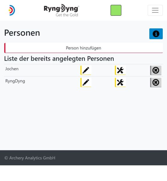 Um den vollen Funktionsumfang der RyngDyng© App zu nutzen, müssen Personen angelegt werden. Für diese Personen können dann Einstellungen hinterlegt werden und erfasste Pfeile werden diesen hinterlegten Personen zugeordnet.