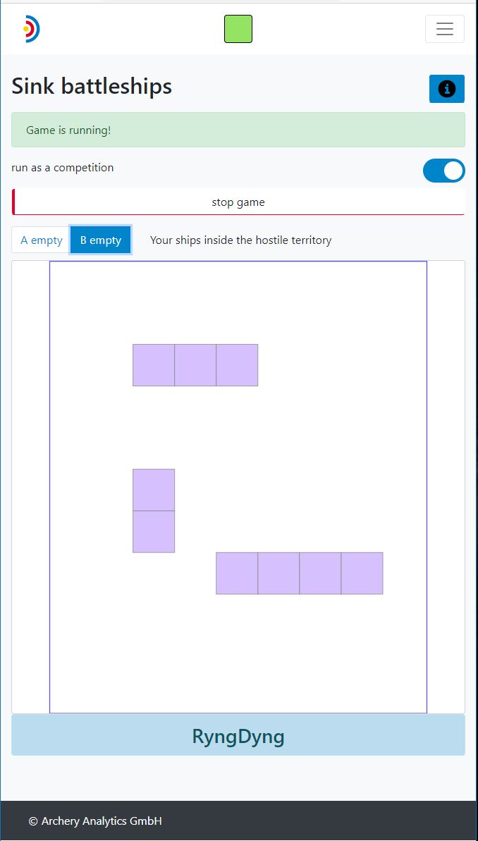 But it's really fun when you compete against each other. Each player has their own half on the target and their own ships in the opposing half. In the right picture you can see the representation when you have a look at the opposing half. Only you can see these ships in your RyngDyng app, the enemy only sees the squares hit like on the left picture.