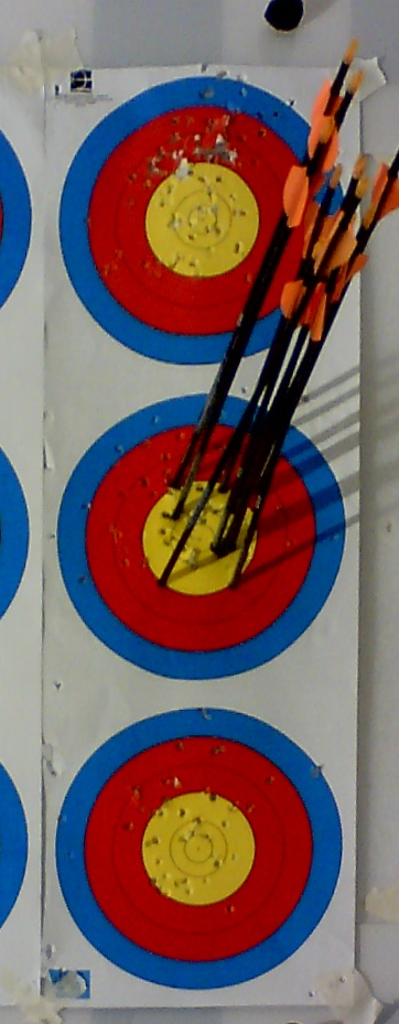Below you can see a situation in our last indoor training session using 4 vertical spots. The first image shows the calibration RyngDyng did for these target faces. The second image shows an end of the training session. All arrows have been detected and recorded. For RyngDyng it doesn't matter whether the arrows arrive at the same point in time or one after another.