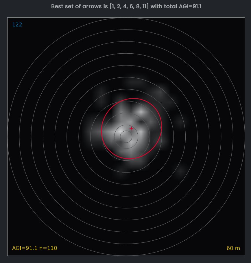 The best set of arrows is numbers 1, 2, 4, 6, 8, 11. The AGI that would have been achieved when using only those 6 arrows is 91.1. This corresponds to a much more narrow grouping compared to all 12 arrows (89.0).