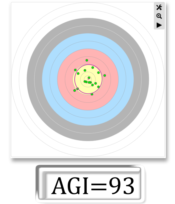 AGI = 100 menas that all your arrows hit the same point. AGI = 0 means that all your arrows are scattered over the whole target face. If you want to have all your arrows inside the gold, you should achieve an AGI greater than 95. As a side note: world class athletes achieve an AGI of 99.0 in in-door tournaments!