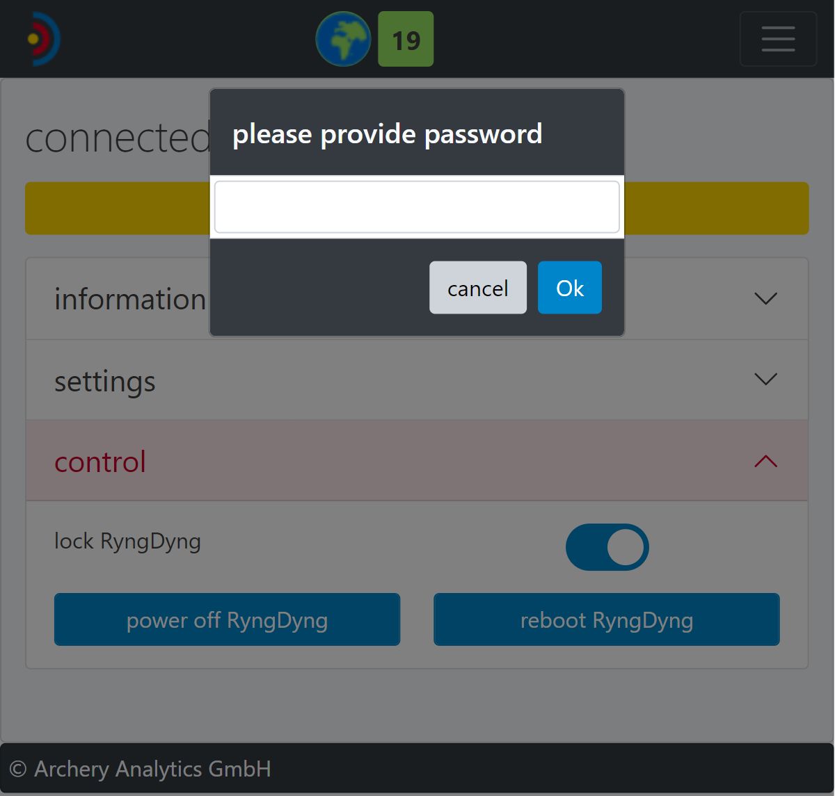 If RyngDyng is locked, a password is requested (see next picture). After entering the password, only apps that have stored the same password can send control commands to RyngDyng. This allows RyngDyng to be protected against unauthorized access during a tournament.