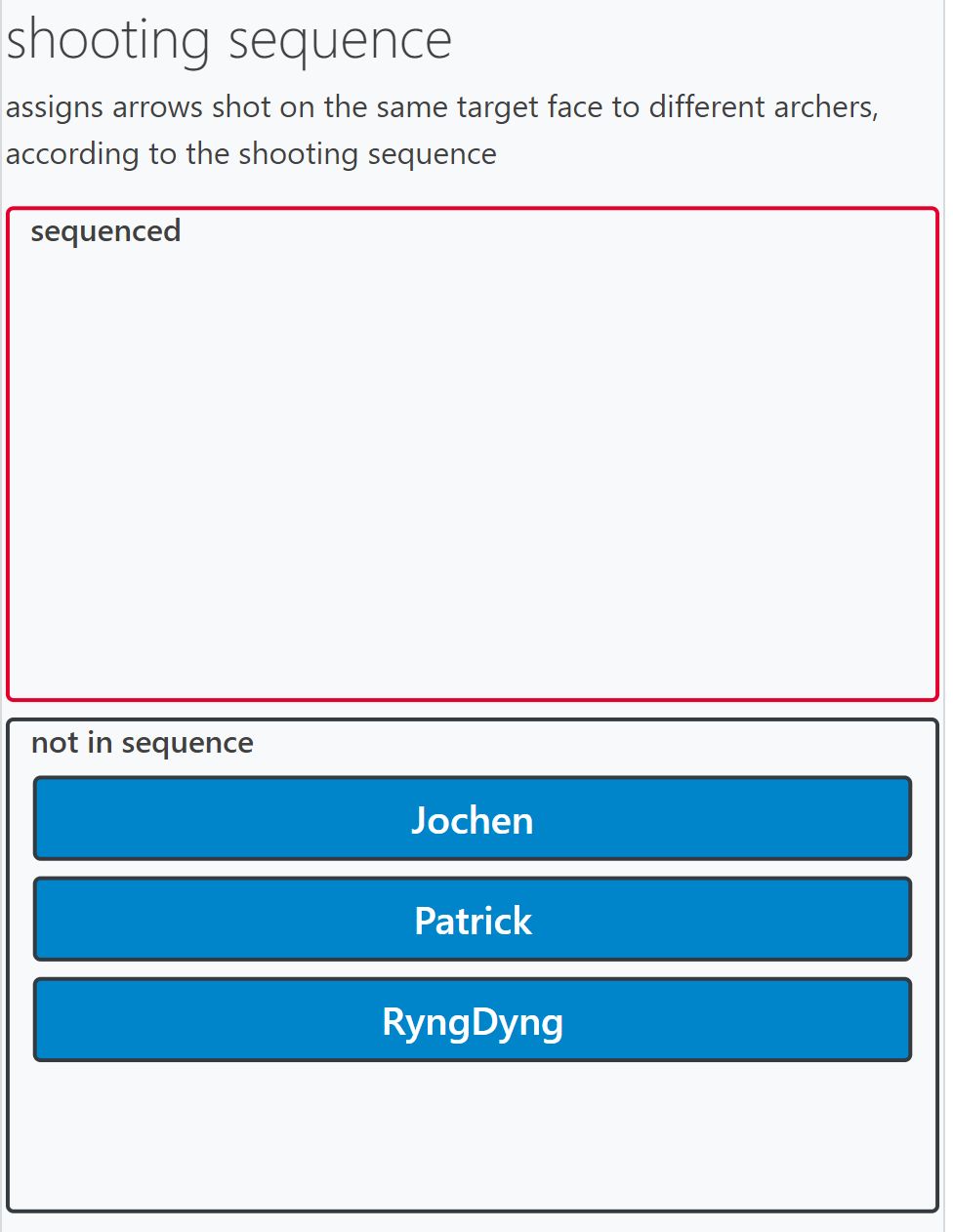 If there is a connection to a RyngDyng and several archers have been created, a shooting sequence can optionally be defined. This is helpful if several archers share a target face and the arrows should still be assigned separately to the individual archers. Arriving arrows are then assigned in turn according to the defined shooting sequence and can thus later be evaluated separately by archer.