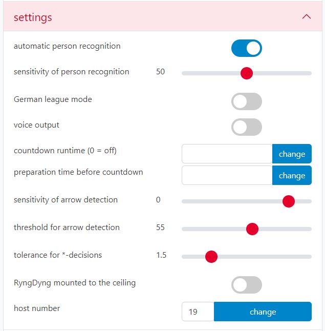 Automatic person recognition: If this function is activated, RyngDyng automatically recognizes people when pulling the arrows and pauses the arrow detection. If no more people can be seen in the picture, the arrow detection is started again and a new end is started. Without automatic person recognition, the arrow detection should be stopped and started at the push of a button, e.g. in tournaments.