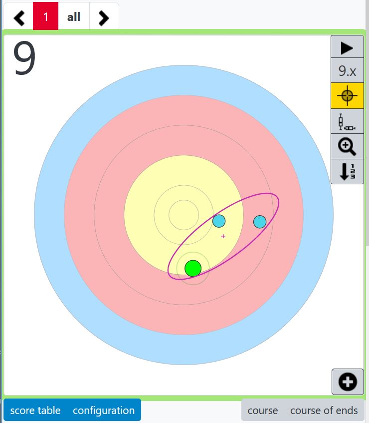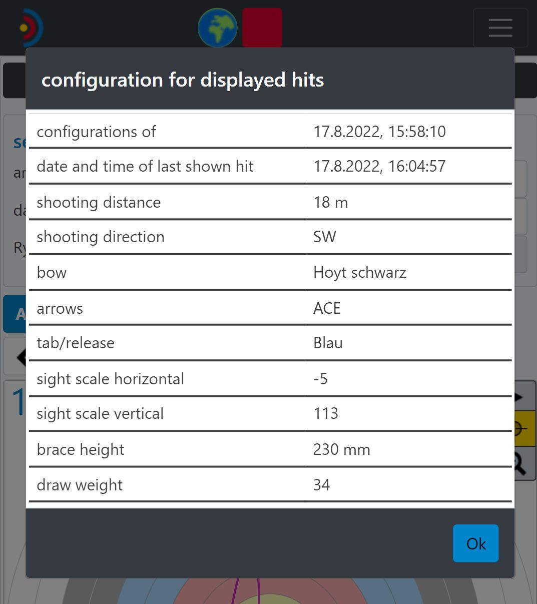 For each displayed end or overlay of ends, tips for sight adjustment can also be called up on the hits page (except for bare bows). In order for this to be possible, some information must be available. The features of the sight should be stored on the server (thread of the sight screws and number of clicks per revolution), and the current distance between the eye and the front sight should be entered in the app. Then the app can calculate how many clicks the sight screws should be adjusted horizontally and vertically to get the arrow group into the center of the target.
