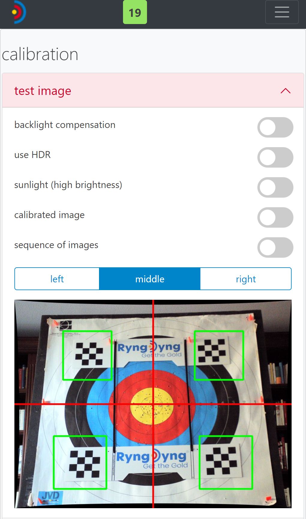 The first step is to point the RyngDyng cameras to the target. For this purpose, test images can be called up with the buttons left, middle and right. The sequence of images supports the alignment of the RyngDyng case by automatically retrieving images every 2 seconds. The red cross hairs should be aimed roughly at the center of the target. If the distance to the target is correct (3 m between the front edge of the RyngDyng case and the base of the center of the target), the image will be sharp and the chessboard squares will be approximately within the green markings.