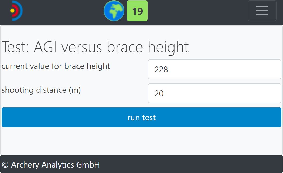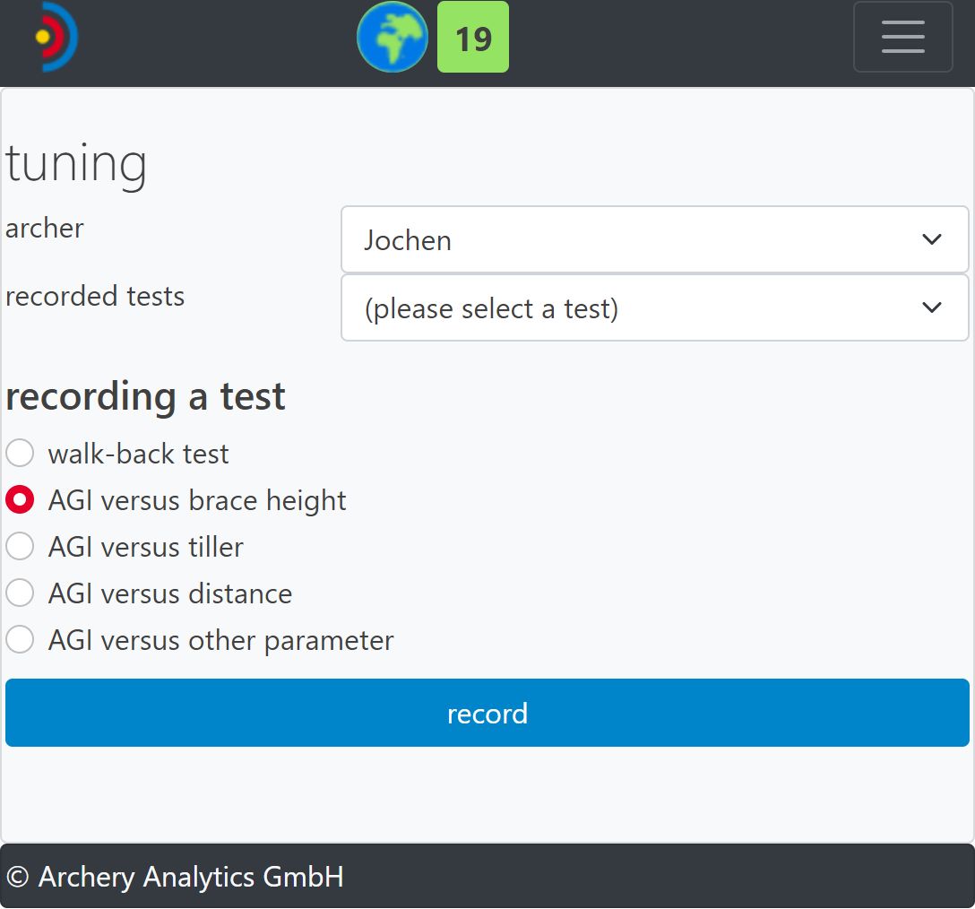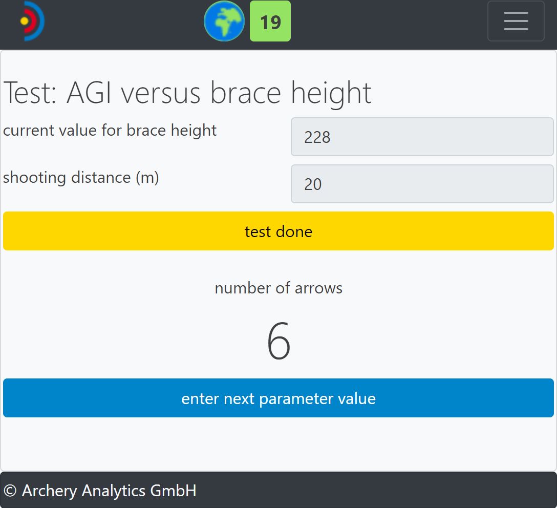 For example, if you select the test "AGI versus brace height" and click on record, you can first enter the starting value for the brace height and the shooting distance (left image). Then the test is started and any number of arrows is shot (picture on the right).