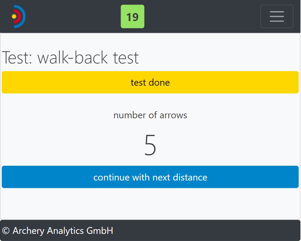 After each end you change the brace height, enter the new value and shoot a number of arrows again. During shooting you can also switch to the hits page with the live view of the hits, but the test recording continues in the background. Once all values have been tested, the test can be ended (test done button).