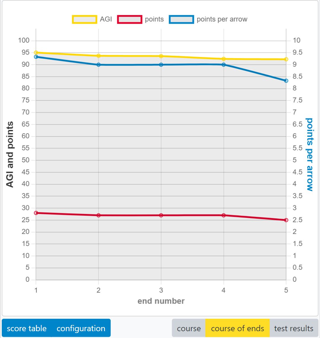 Evaluations of the course of the score numbers are visible with the button course (left image). The course of ends button generates the diagram with important key figures for the individual ends (picture on the right). Here you can see, for example, how your performance has changed over the course of a training day or a tournament.