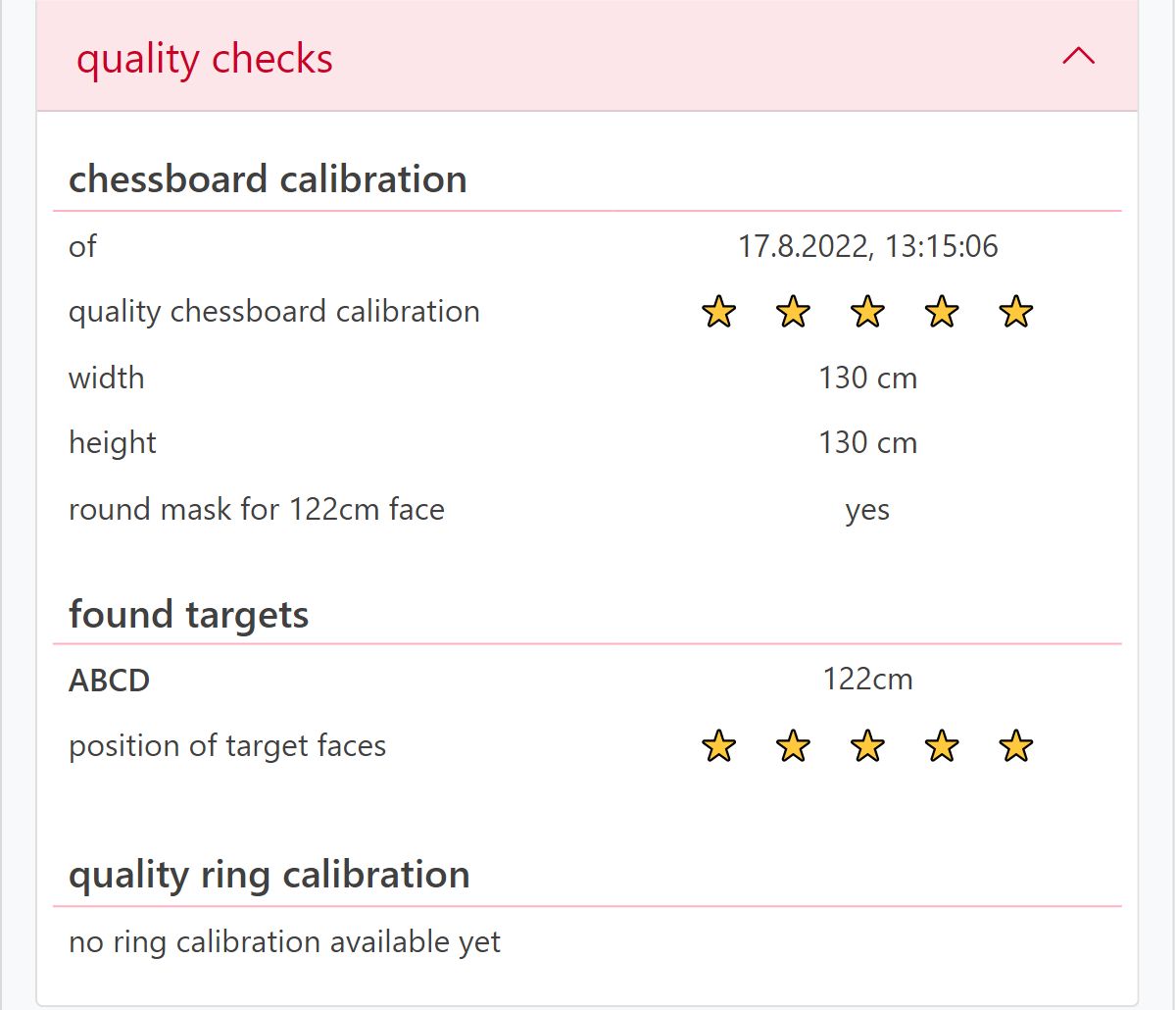 You can check the quality of the calibration at any time in the quality checks section. The left image shows the quality of the chessboard calibration and the faces' positions. After the start of the arrow detection, there is information about the quality of the ring calibration and a control image (right image).