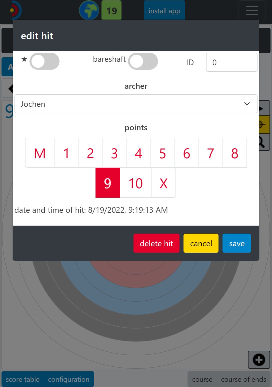 If you click on a displayed hit (enlargement with the magnifying glass can be helpful), you can edit the hit. You can change the number of points, assign an arrow number, mark the arrow as a bare shaft or delete it (left image). You can also manually add an arrow by first clicking on the plus symbol