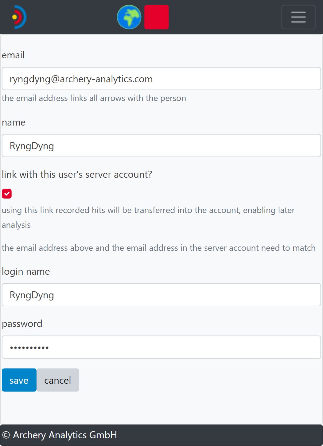 After pressing the add archer button, the left mask appears. If this person already has an account on Archery Analytics' server, you can also enter the access data for the account (right image). This will connect the app to the server account and all detected arrows will be transferred to the server. More details are described in the document